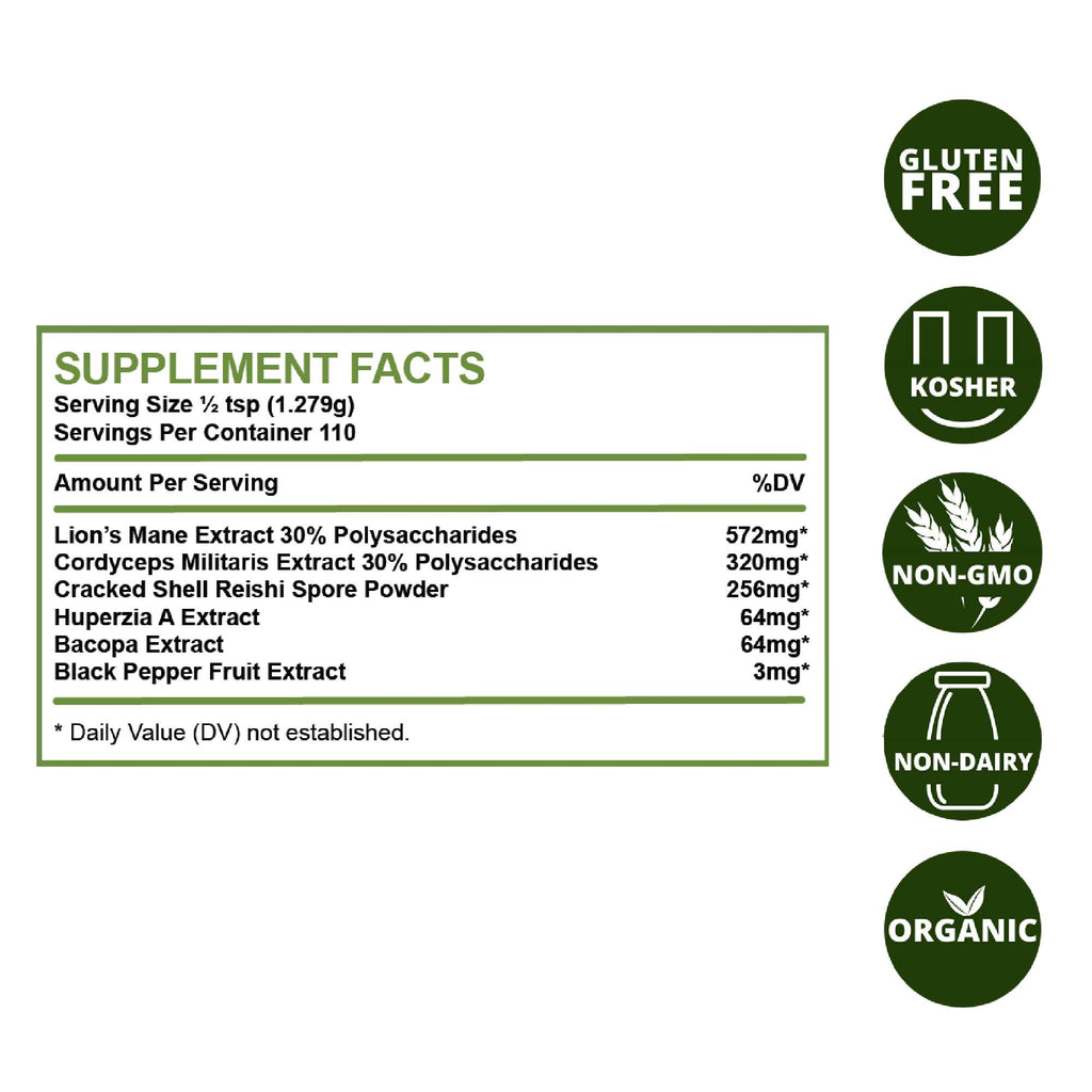 With 1.3g of nootropic mushroom and herbal extracts per serving, this superfood powder will boost your brain. Take 3-4 servings a day to:
