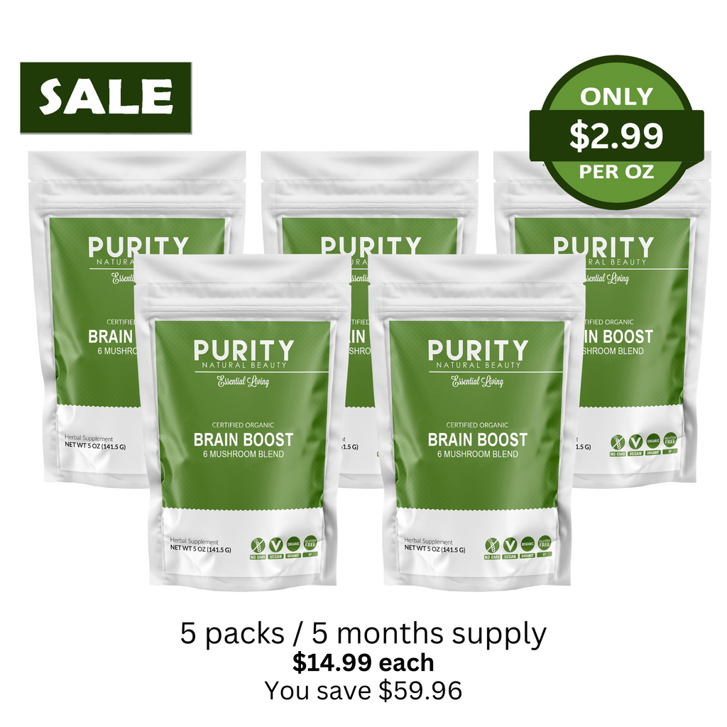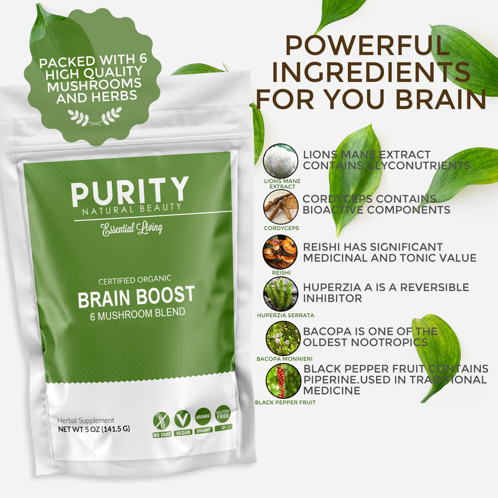 Brain Boost provides 6 of the most well-studied nootropic mushrooms and herbs, all in one bag: extracted Lion's Mane, Cordyceps, Huperzia, Bacopa, and Black Pepper Fruit and Cracked Shell Reishi Spore Powder.